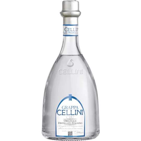 Cellini Cru ist eine gehobene Grappa-Bianca Qualität, mit einem hohen Anteil an Mono-Vitigno-Destillaten und reinen, warmen Aromen.